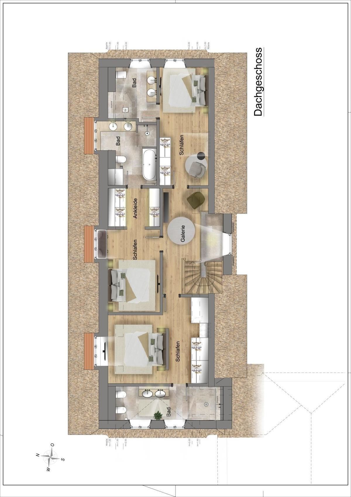 Das Erdgeschoss verfügt über einen einladenden Eingangsbereich mit Garderobe, ein gemütliches Wohnzimmer mit Austritt auf die großzügige Südterrasse (ca. 55 m²) sowie einen Essbereich mit Zugang zur Westterrasse. Eine separate Küche, ein ebenerdiges Schlafzimmer mit Bad en Suite, ein Hauswirtschaftsraum sowie ein Technikraum und ein Gäste-WC komplettieren die Ebene. Im Dachgeschoss befinden sich eine Galerie sowie drei großzügige Schlafzimmer - jeweils mit Bad en Suite.
