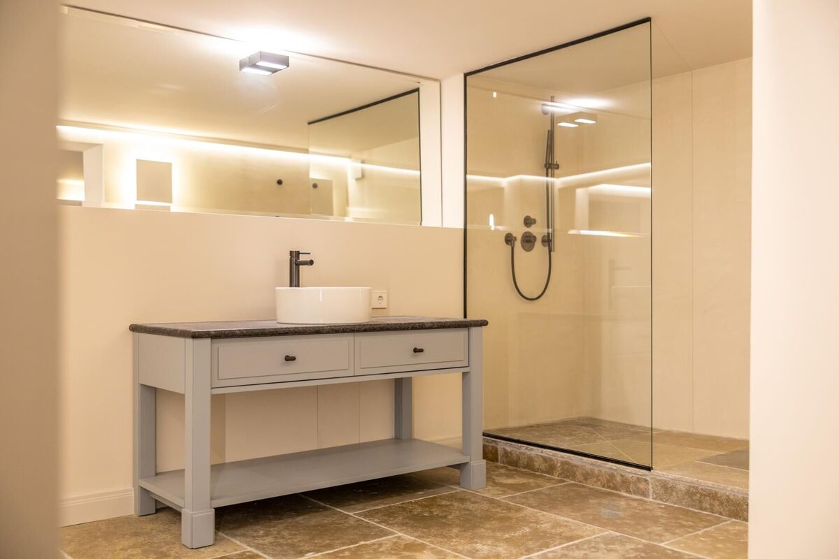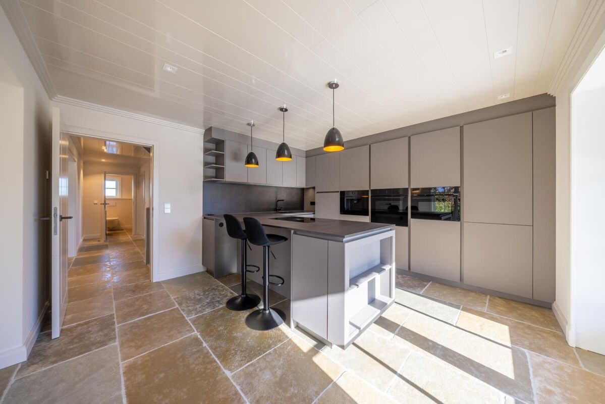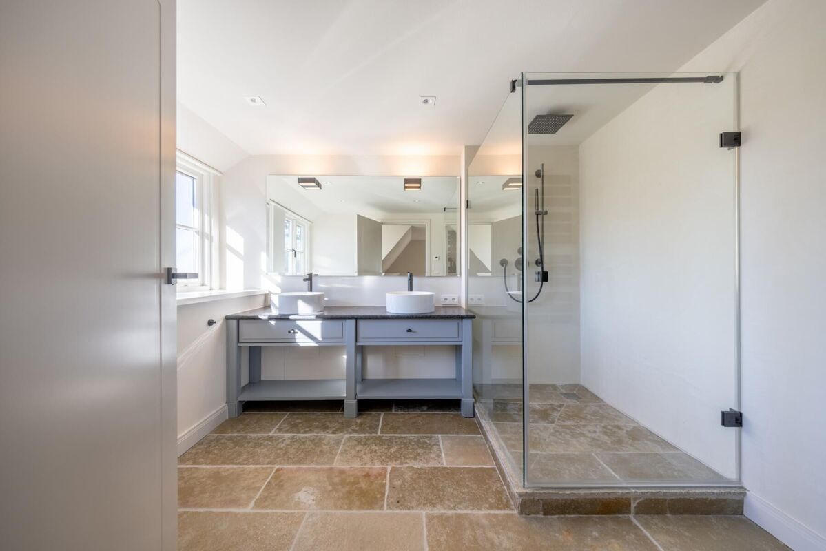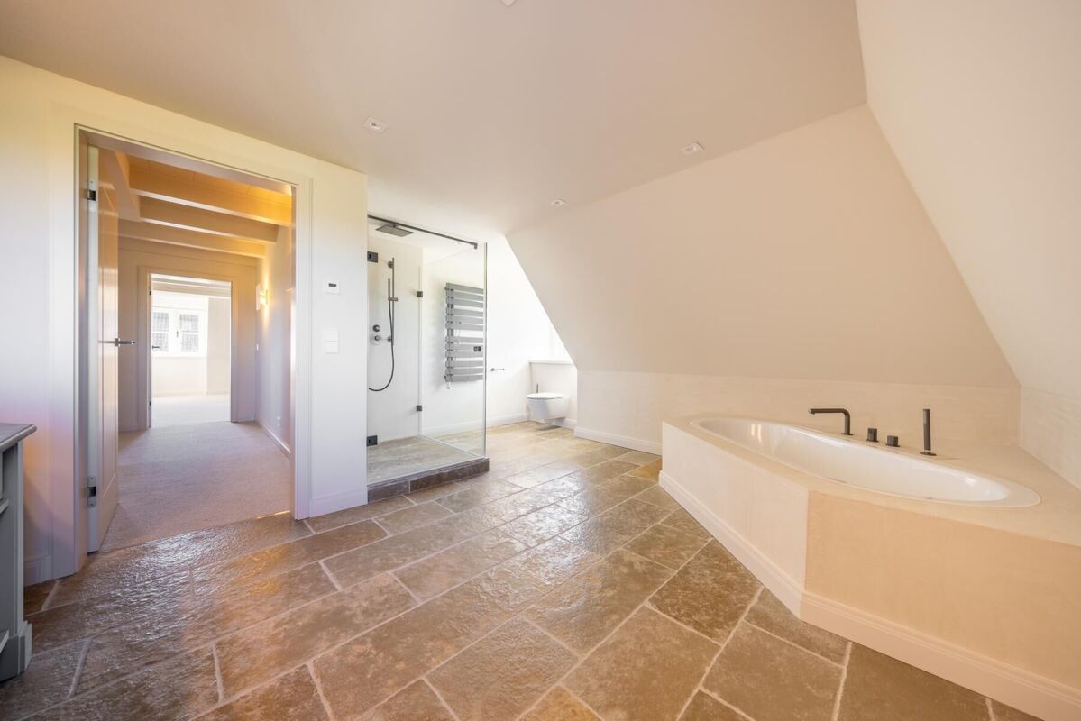 Im Obergeschoss befinden sich drei Schlafzimmer sowie zwei elegante Badezimmer, welche mit hochwertigen Materialien und geschmackvollem Design überzeugen. Diese Etage bietet sowohl Privatsphäre als auch ausreichend Platz für Familie und Gäste.