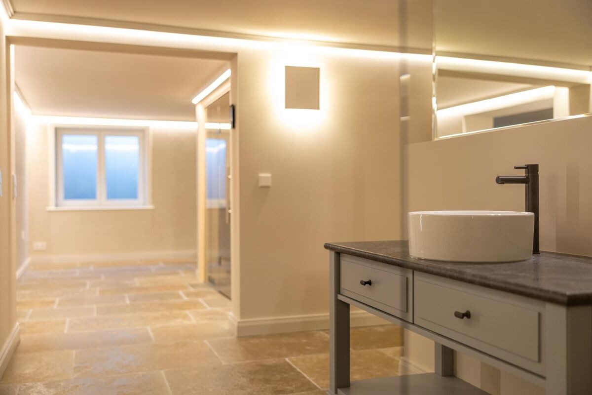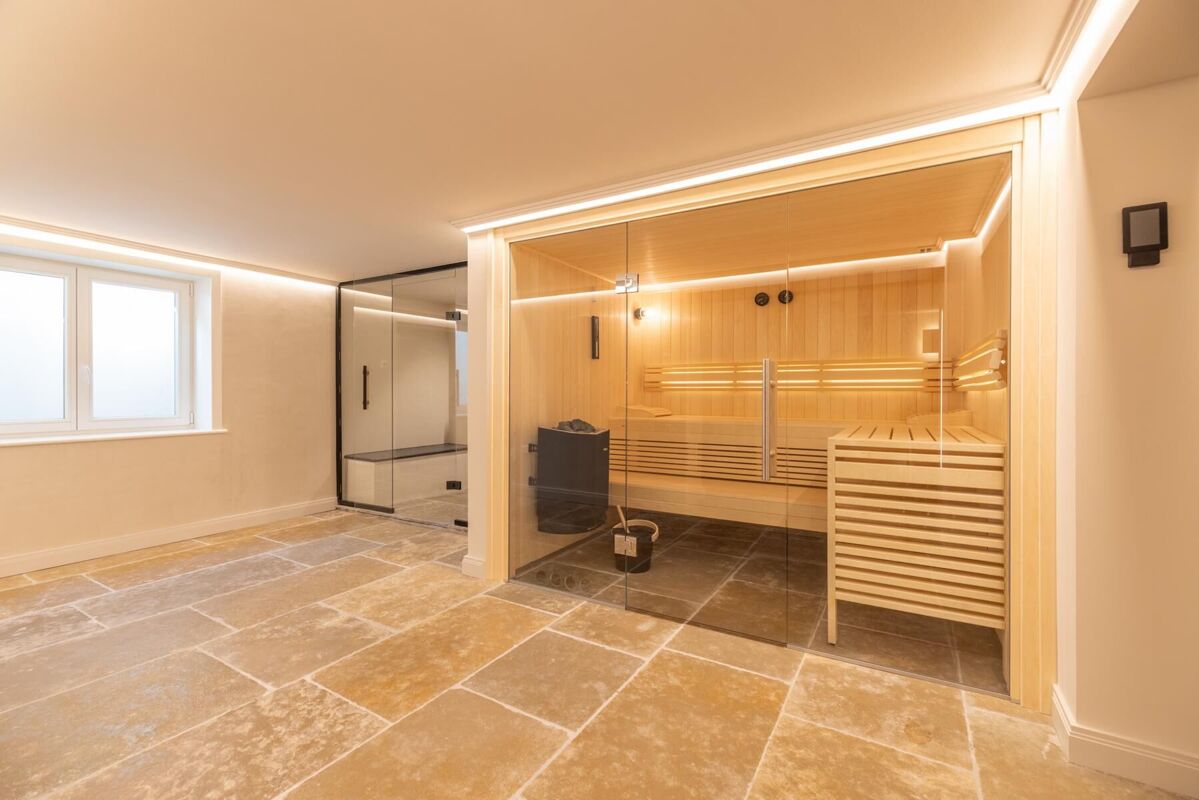 Im Untergeschoss erwartet Sie ein einladender Wellnessbereich mit Sauna, Dusche und sep. WC. Ergänzt wird dieser Bereich durch einen Hauswirtschaftsraum, Abstellflächen und Technikräume, die praktischen Stauraum schaffen.