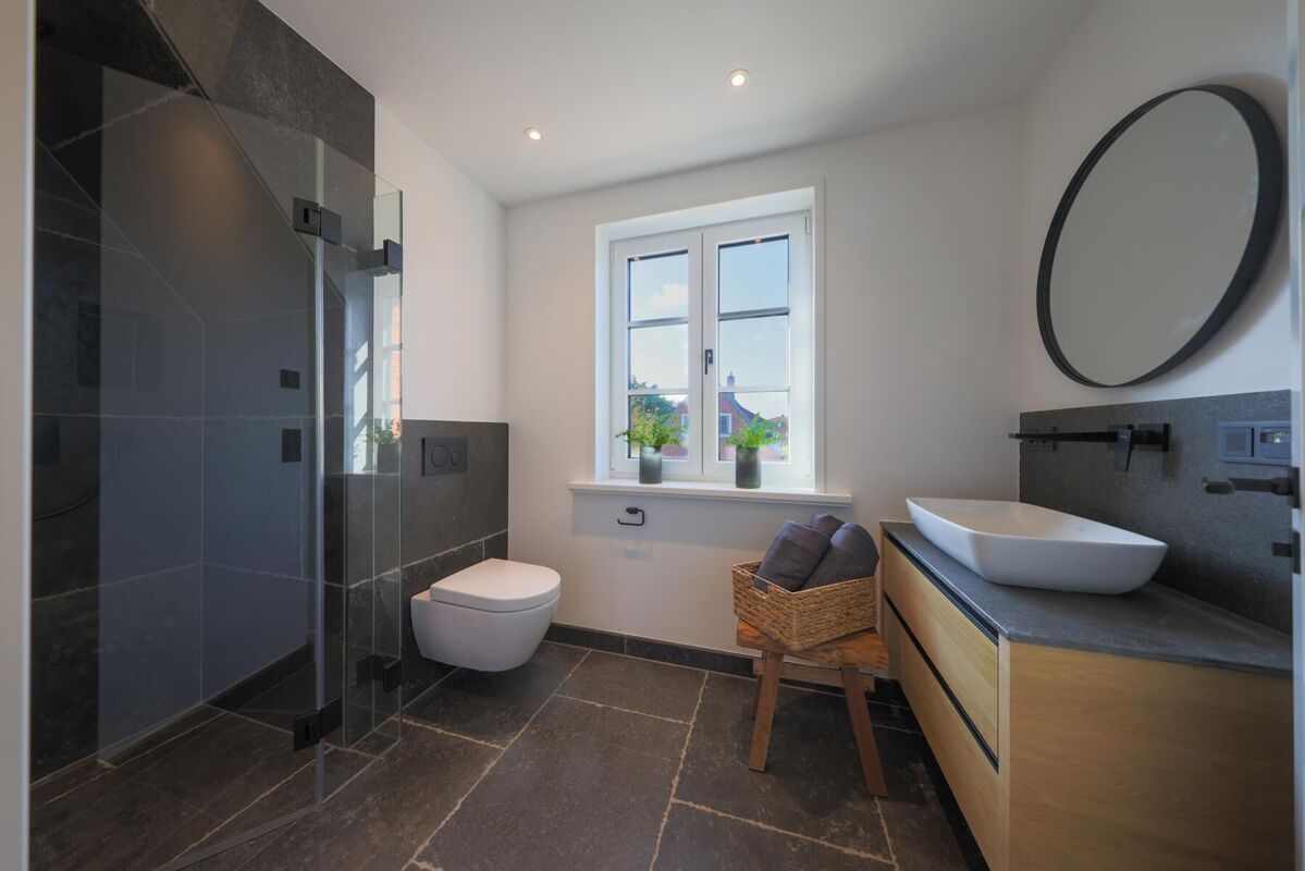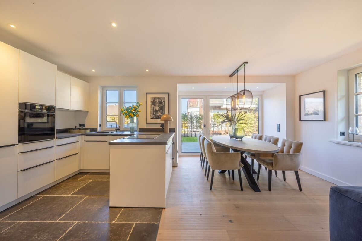 Beheizt wird dieser Neubau mit einer energieeffizienten Wärmepumpe und Fußbodenheizung auf allen Etagen. Die Bäder sind mit der Serie Villeroy & Boch Subway sowie hochwertigen Armaturen von Hansgrohe in Schwarz matt ausgestattet.