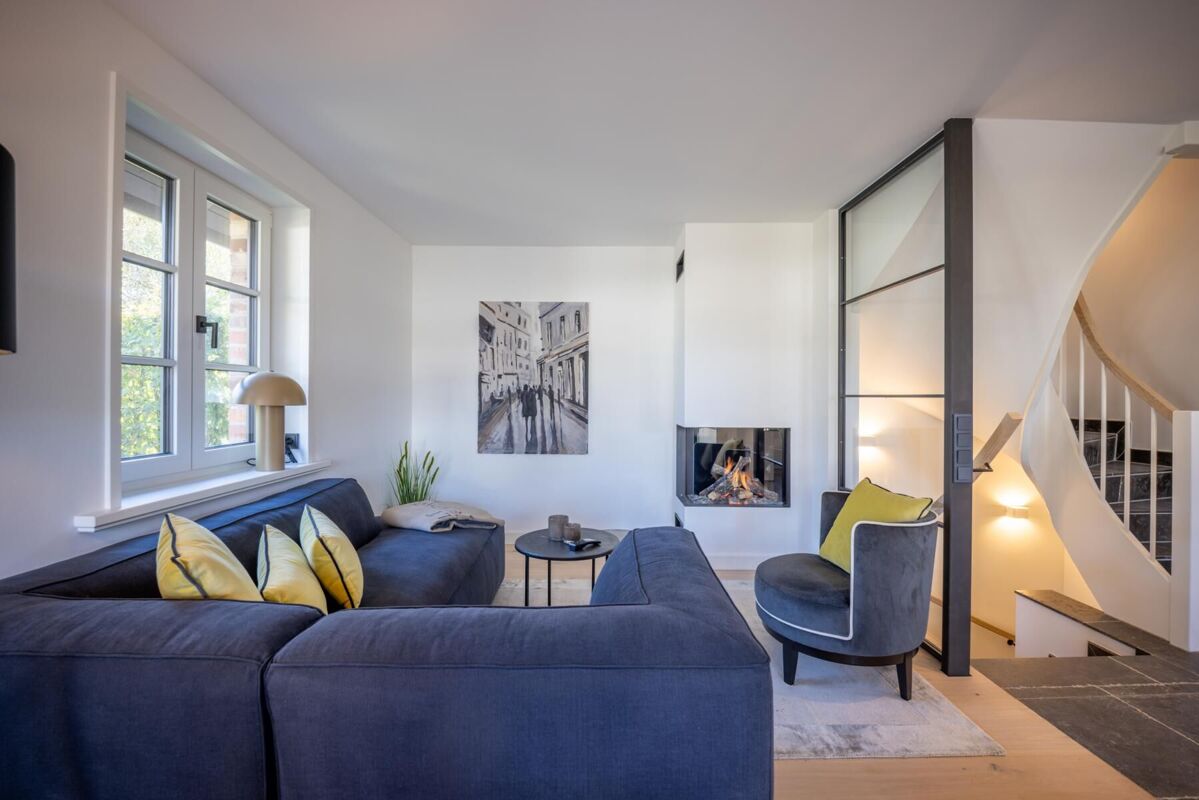 Das Raumkonzept überzeugt durch eine durchdachte Aufteilung: Insgesamt fünf Zimmer, darunter vier gut proportionierte Schlafzimmer, bieten ausreichend Platz für Familie und Gäste. Zwei moderne Bäder sorgen für Komfort im Alltag. Mittelpunkt des Hauses ist der helle Wohnbereich mit Kamin, der ein behagliches Ambiente schafft.